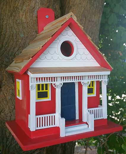 Capitola bills itself as California's oldest beach resort. It features trendy shops and restaurants on its shore directly connecting to a fishing wharf and its large, sandy beach. In the summer of 1961 hundreds of birds attacked the town. Alfred Hitchcock, who was a regular visitor to nearby Santa Cruz, read about this episode and went on to direct a film—The Birds—based on the idea of hundreds of birds attacking humans. The reason for this attack remained unknown for over 25 years until it was discovered that the birds had been affected by domoic acid, a toxin produced by red algae. This red house with a blue door and light yellow window frames comes equipped with a mounting bracket for easy installation. A 1-1/4" hole will allow wrens, finches, chickadees, nuthatches and titmice to nest. The roof is topped with sturdy pine shingles. Ventilation, drainage and a removable back wall make this house fully equipped for years of use.