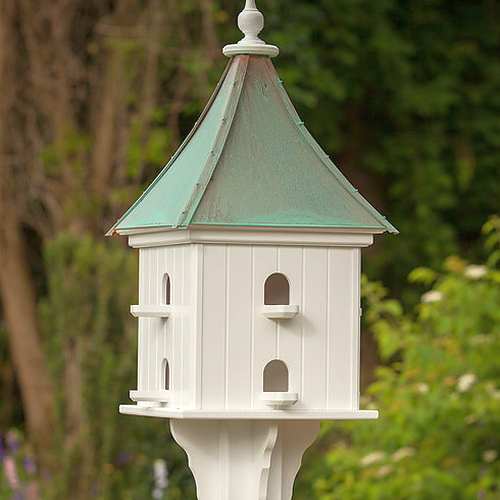 Fancy Purple Martin House 14" Eight Compartment with Patina Copper Roof - Measures 36" high x 14" wide, square shaped, PVC construction, 8 nesting compartments with approx. 1-7/8" x 2" openings perfect for attracting Purple martins, 8 perches, brackets attached, removable solid copper roof for easy cleaning, fits on 4" x 4" vinyl sleeve post which fits over 3 1/2" x 3 1/2" pressure treated wood post.