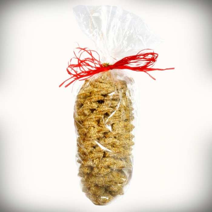 Just what birds have been looking for! A GIANT sugar pine cone covered in tasty, energy-packed millet and sunflower seed, then tied with twine to drape easily over a branch. A fun and natural way to decorate an outdoor tree in your own yard, these seed covered pine cones arrive in a clear gift bag with green garland and a red raffia tie that's ready for gifting. Made in the USA!