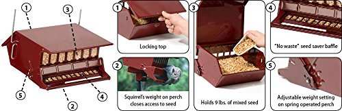 For smaller yards, this is the Bird Lover's Choice for squirrel proof feeders with adjustable weight settings. Spring operated perch with adjustable weight setting closes access to seed. Single sided feeding for best bird viewing with seed saver baffle. Generous 1.5 gallon/9 lbs.seed capacity. Pole mounting hardware and hanger included. It holds sunflower seeds, peanut halves, safflower, finch/specialty mixes and more. Easy to fill and clean. Durable powder coated steel construction. 5 year manufacturer's warranty. Made in the USA!
