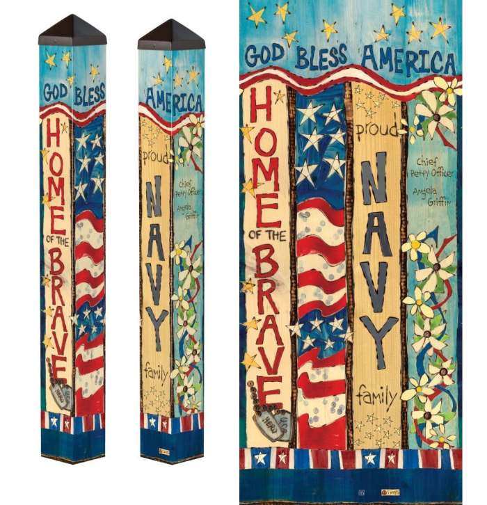 Navy Custom 3 ft. 4x4 Art Pole - This Custom Patriotic Art Pole is the perfect gift for a promoted soldier, retired veteran, or for a family who lost a loved one in the armed forces, Army, Navy, Marines (USMC), Air Force, and Coast Guard . Personalize with your beloved service member's military branch, name, and rank (optional). Your one-of-a-kind Art Pole will look as if it were hand-painted and burned by artist Stephanie Burgess herself.