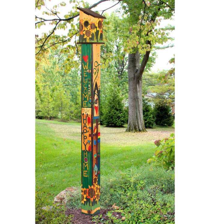The Sing Out Loud Birdhouse Art Pole features a superb design that caters to bluebirds but also works well with chickadees, nuthatches, titmice, tree swallows, and wrens.