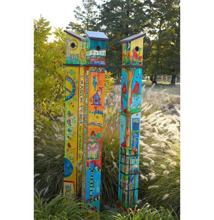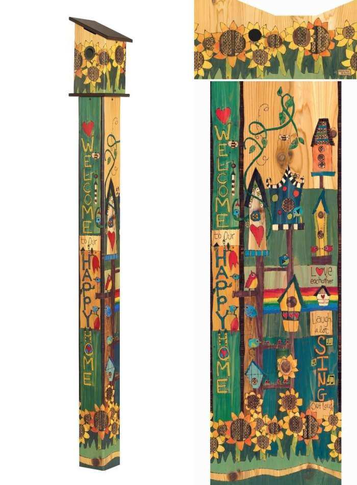 Our Sing Out Loud 6' Birdhouse Art Pole features a fledgling ladder, a universal 1.5" hole, and holes for ventilation and drainage. Remove the rooftop screws for easy cleanout. It is a state-of-the-art reproduction of hand-painted and wood-burned cedar pole. The artwork is laminated onto a strong lightweight PVC pole for fade-resistance, durability, & reduced shipping cost. Easy to install. No digging necessary! All hardware included. Made in the USA. Artist, Stephanie Burgess.