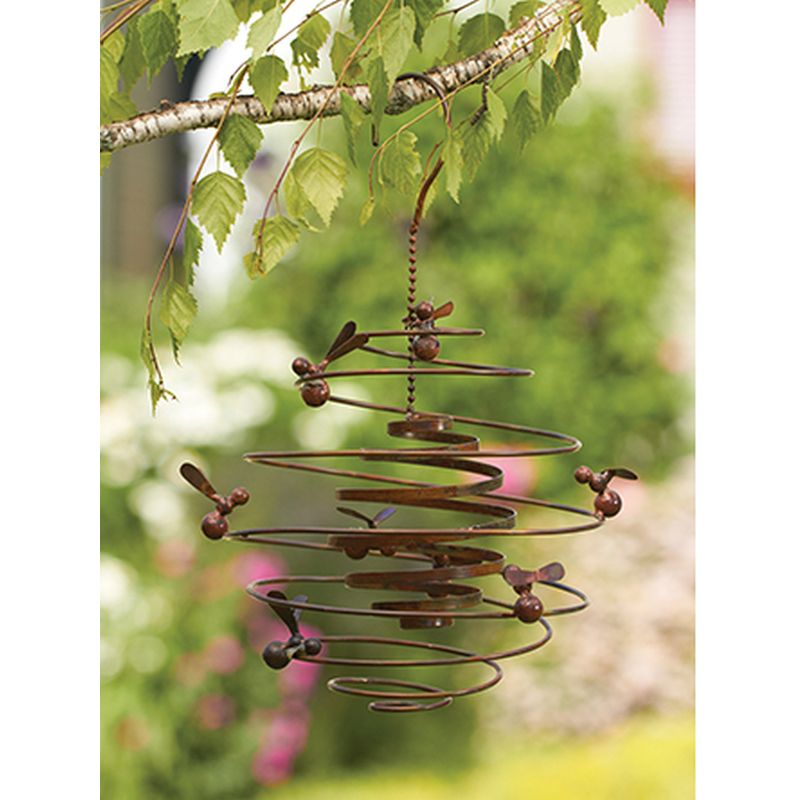 These colorful bees frolicking around a copper spiral will add a bit of whimsy to your garden. Metal bees with famed copper finish embellish the outside spiral that moves in the wind around a separate spiral dangling freely inside the spiral producing a mesmerizing effect. Handcrafted with lots of attention to detail. Attractive verdigris copper finish throughout the piece. Hook with chain included. Hang from a shepherd's hook, planter hook or tree. Truly a work of art. These make wonderful gifts for any occasion.