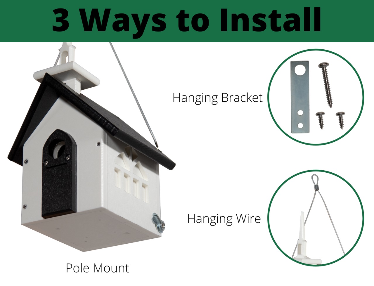 Mounting Options: Hang (cable included), Tree or Post (metal bracket included), Pole (predrilled pilot holes on bottom)