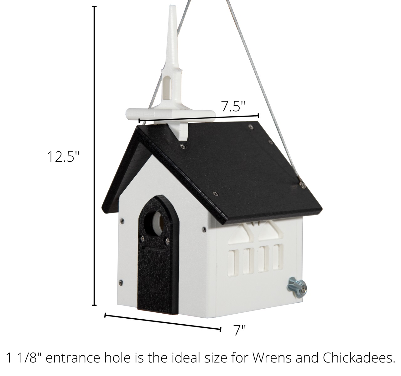 Recycled Poly Wren/Chickadee Church House - Made with both birds and birders in mind, this eco-friendly wren house combines functionality with fun in your garden. Featuring a built-in predator guard and 1-1/8" entrance hole, this birdhouse accommodates house wrens and chickadees with ease without allowing larger bully birds and potential predators in. This wren house also features multiple mounting styles, perfect for your garden! Hang from a deck hook using the attached hanging cable, mount to a tree using the included metal bracket, or attach to a top-mount pole using the pre-drilled pilot holes in the floor of the house. No matter how you choose to display your church house, your birds will love it. Cleaning this wren house is also a breeze, simply turn the attached turn button and lift the side door open for easy access. Made with durable and sustainable recycled poly lumber, this house will last in your garden for seasons to come. Proudly made in the USA!