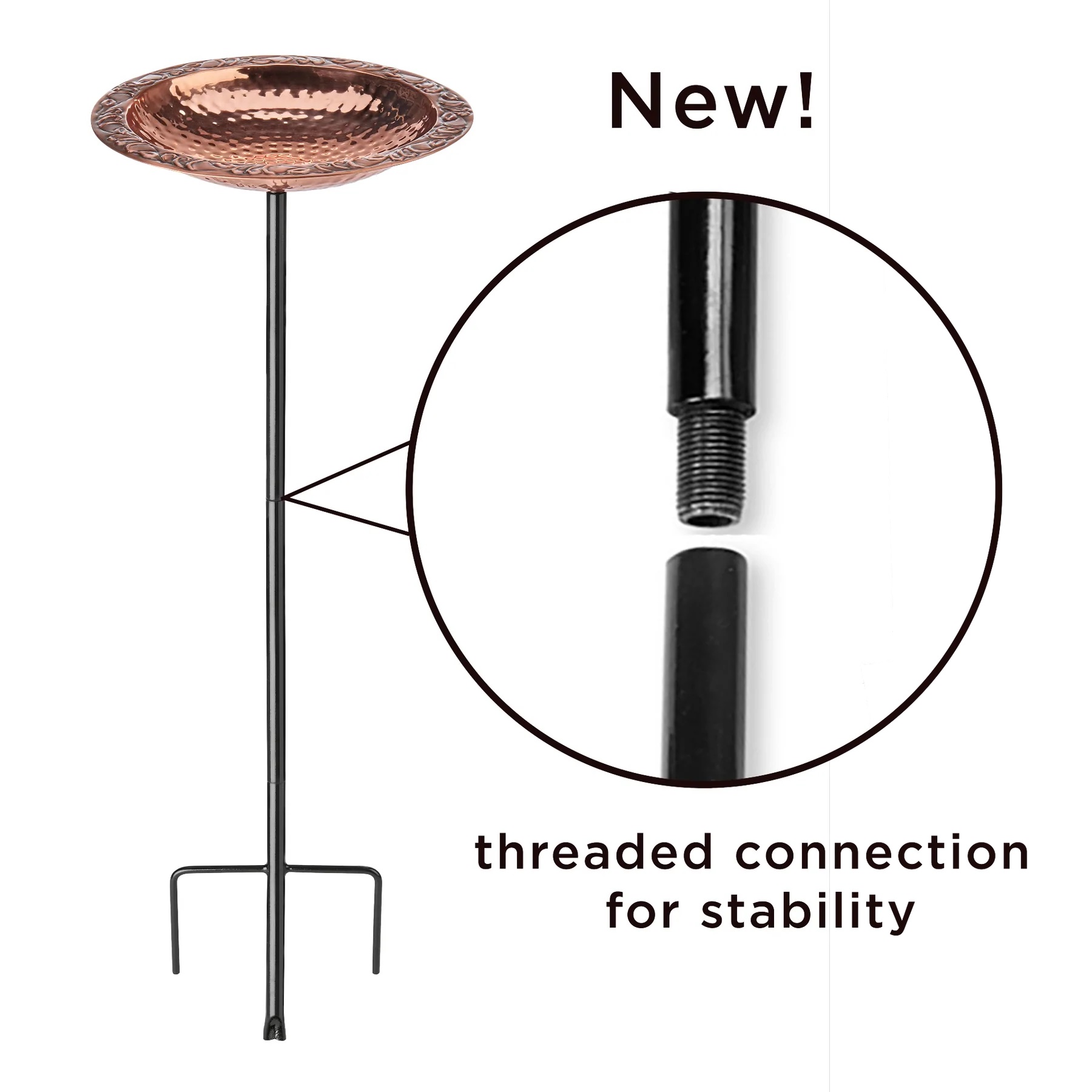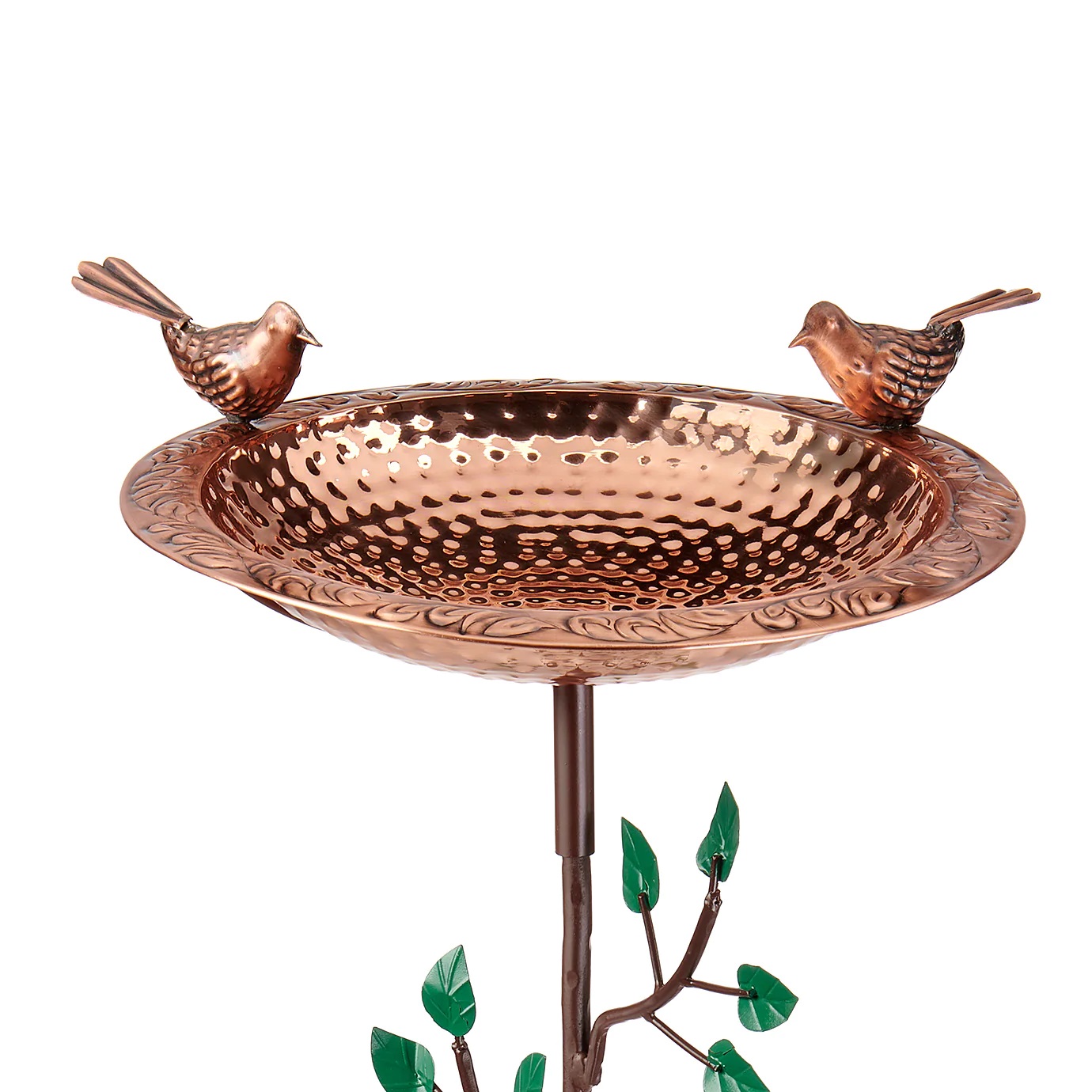 Our Pure Copper Bird Bath with two birds and a tree themed garden pole adds ambiance to any outdoor oasis, bringing beautiful birds to any backyard. A multipronged garden pole serves as a sturdy support for this classy copper bowl. Creativity combined with high-quality materials, producing a piece that is built-to-last. Simply place atop the included garden pole, this standing bath attracts an array of birds. The decorative edge doubles as a retreat for feathered-friends to rest between drinks. Measures: 42” H x 13.5" W x 13.5” D. Makes a wonderful gift for any backyard bird enthusiast!