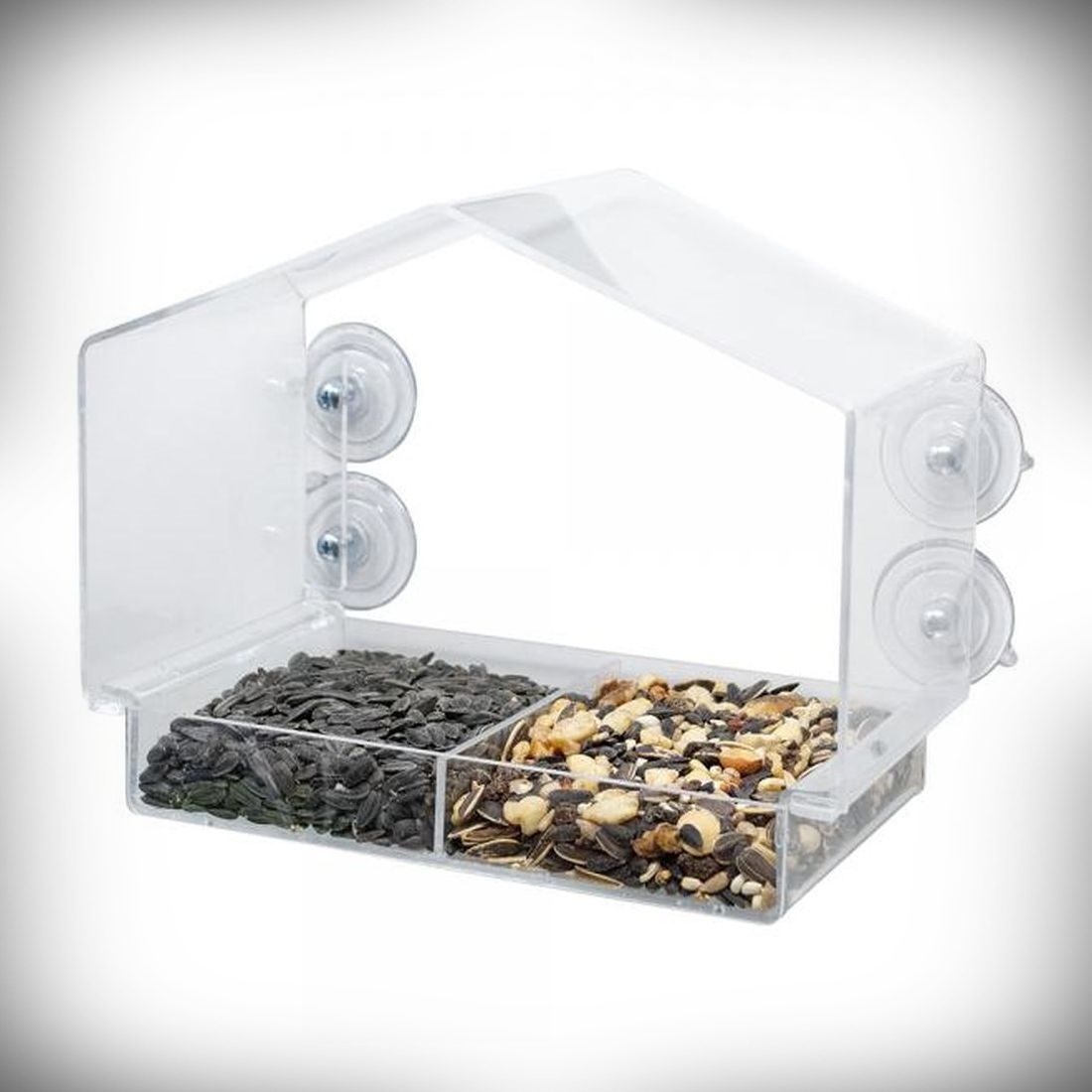 Songbird Window Feeder with Divided Tray - Modern and functional, this split compartment clear acrylic bird feeder will become your new favorite way to enjoy visiting songbirds. Features a durable polycarbonate construction that provides a clear, unobstructed view of birds. This helps you observe bird behavior and feeding habits up close. The feeder easily adheres to any window with four included suction cups making it perfect for a picture window. Just slide out the seed tray to refill. Holds approximately 3 cups of seed. Made in the USA!