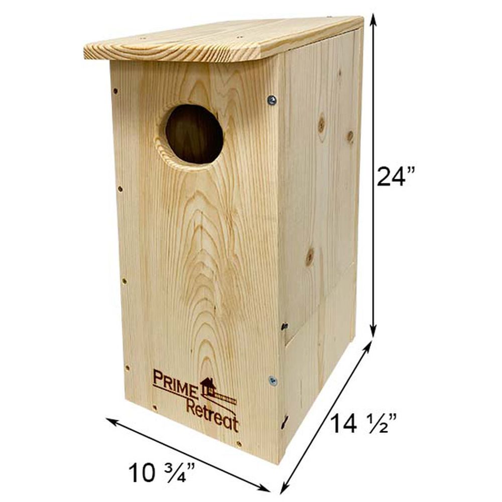Pine Wood Duck Nesting Box - Provide beautiful waterfowl a robust shelter by adding the Prime Premium Pine Wood Duck House to your water's edge. These colorful birds typically nest in abandoned woodpecker or other cavities, as they are unable to excavate their own, and this generous roosting box lends them another fantastic option. Made from classic pine, this significant shelter wonderfully meets the needs of wood ducks. Its 4" wide and 3.25" tall, oval opening is perfectly sized for this duck, and the deep body keeps nestlings far away from predators. An overhanging, slightly sloped roof prevents rain from entering the home, and slits beneath it ensure plenty of ventilation. Corner gaps on the nest floor offer drainage, and a metal grid below the entry helps fledglings climb to it when ready to exit. One side panel opens in dual levels for cleaning or nest checks, and makes it easy to affix a mounting bracket (not included) to the base for placement on a post. The home can also be attached to a tree near the water's edge, where wood ducks typically nest. The 0.75" thick, all pine construction forms a hardy abode, and the wood weathers beautifully over time for a striking effect. Ensure ducks have plenty of nesting options by placing the Prime Premium Pine Wood Duck House in your yard. Made in the USA!