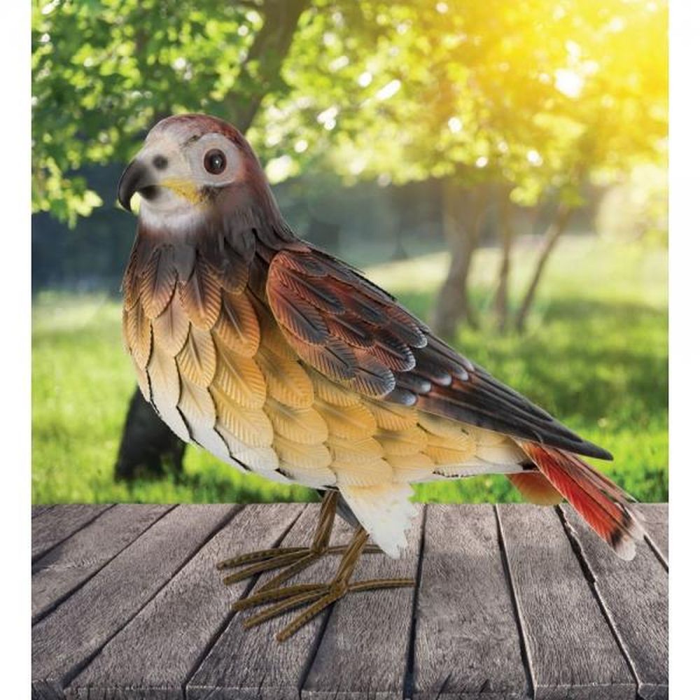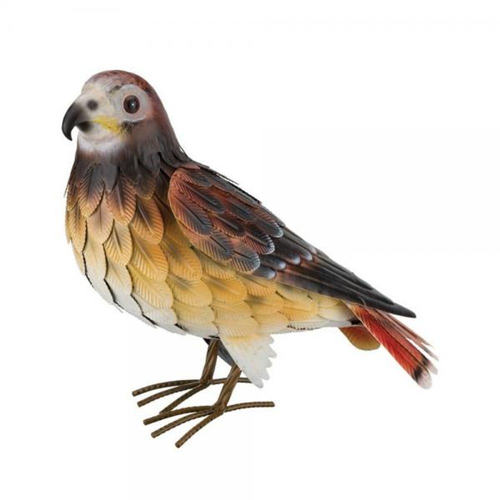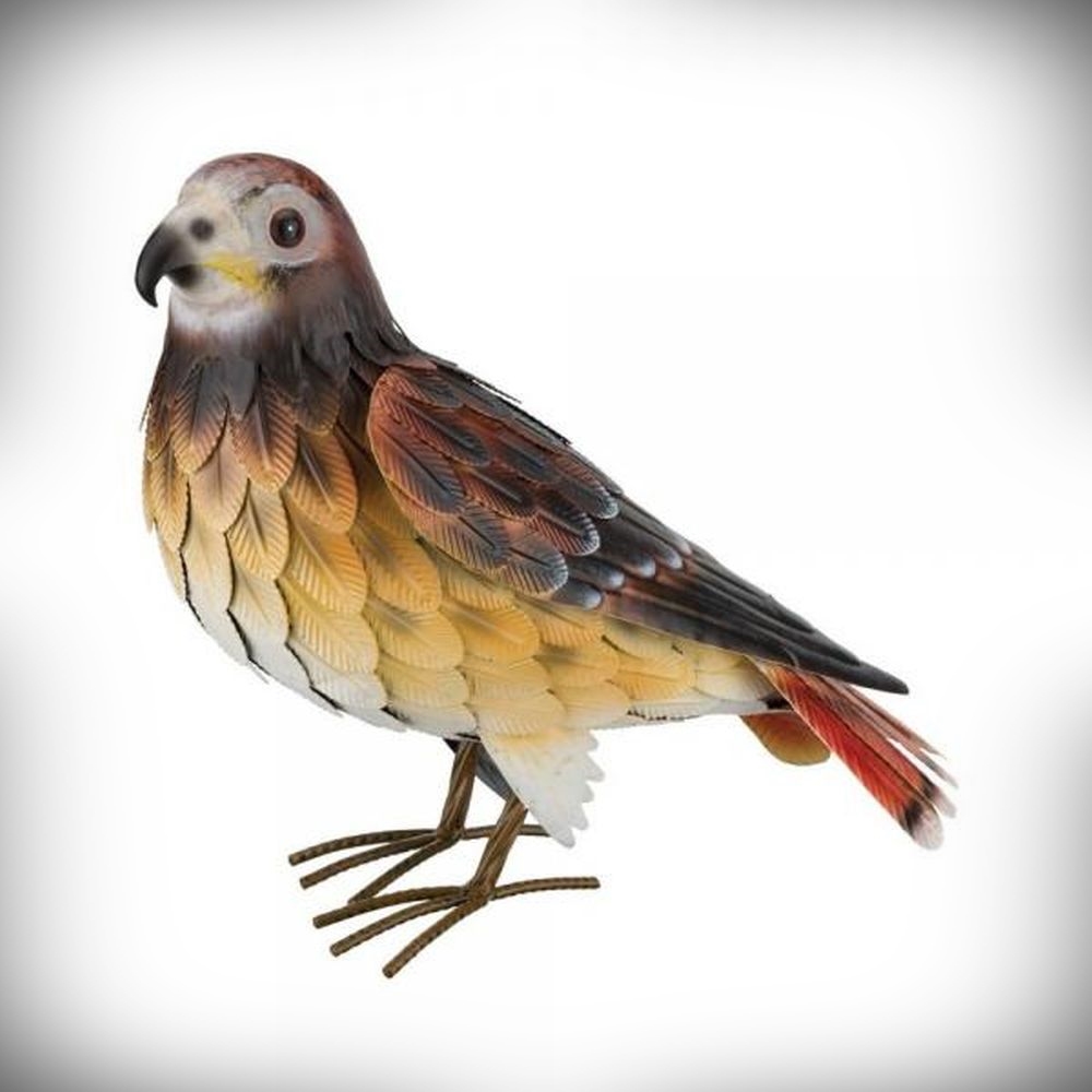 Red-Tailed Hawk Decor Sculpture 15" - Adorable Red-Tailed Hawk Decor with inquisitive look. All metal construction. Hand painted in bold colors, with highlighted feathers and prominent beak. The hand-painted finish utilizes anemometer paint and powder coating to resist fading and rust.