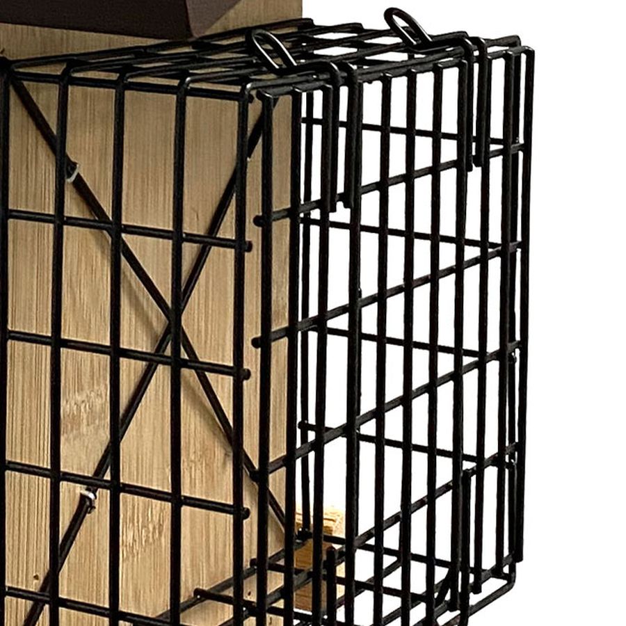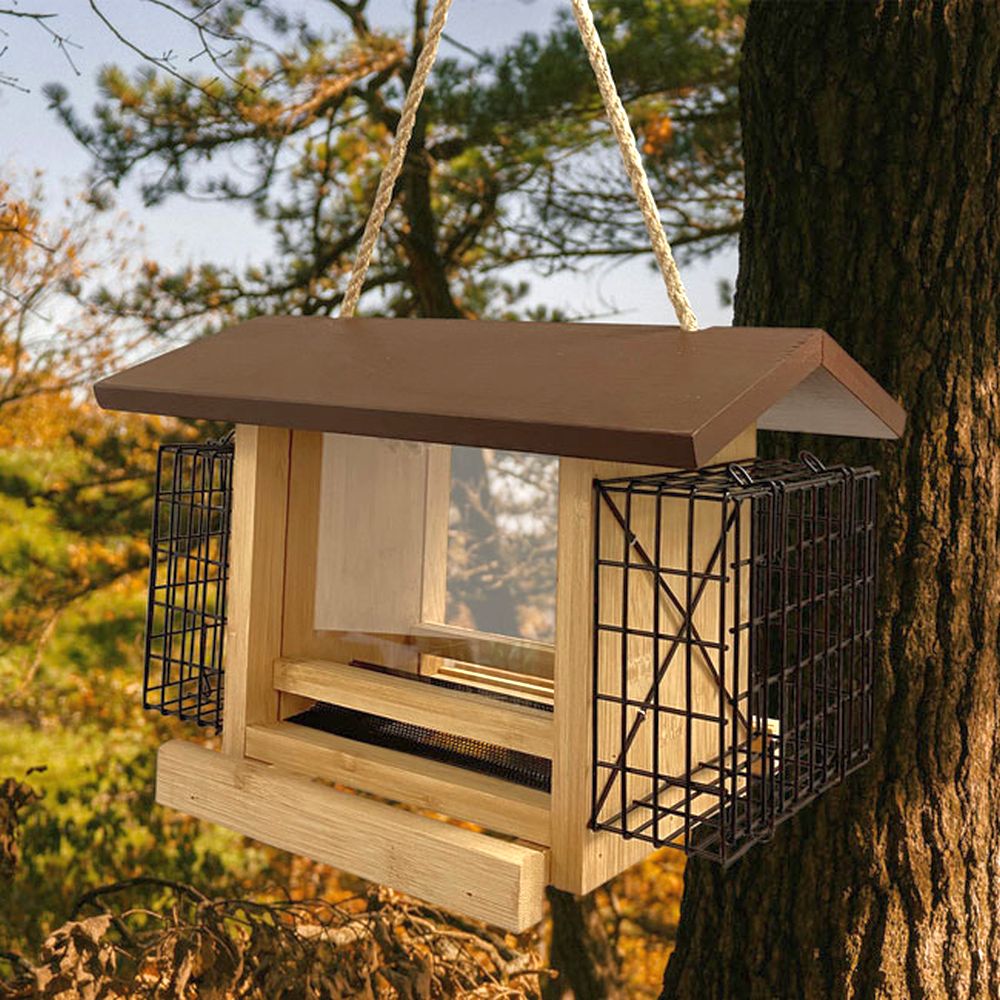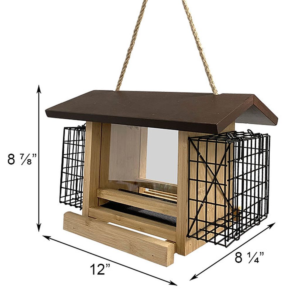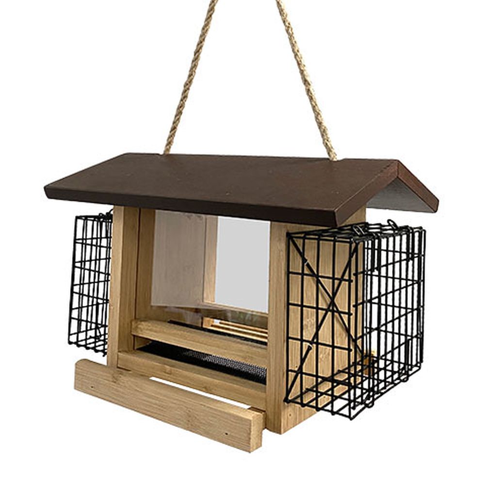 Audubon Ultimate Renewable Bamboo Ranch Bird Feeder with Suet Cages - Offer birds two different types of feed in an environmentally friendly way with the Audubon Ultimate Renewable Bamboo Ranch Bird Feeder with Suet Cages. The recognizable shape and traditional design add a timeless look to your bird garden, while the sustainable frame lends it a green element. Fast growing, easy to cultivate bamboo slats create this feeder body, with plastic panels forming a reservoir. This center chamber holds 2 quarts of safflower seeds or peanut splits, and an overhanging, dark brown roof protects this feed from rain. A gap at the base of each plastic panel allows seed to exit onto the bottom tray for birds to dine, and a raised diverter aids the reservoir in emptying completely. Each wooden upright holds a metal cage, for placing a standard seed or suet cake in them. An attached rope hanger makes it simple to suspend this piece from a hook or bracket, and the dark and light brown tones offset your foliage. The bamboo body resists water, insect, and squirrel damage, and the plant grows quickly, making it easy to harvest again and again. Care for both birds and the natural world with this Ultimate Renewable Bamboo Ranch Bird Feeder with Suet Cages.