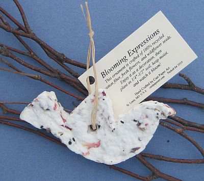 Each ornament is crafted of 100% recycled cotton fiber, fresh flowers and wildflower seeds.