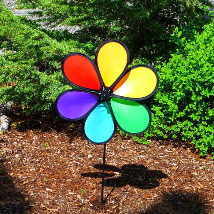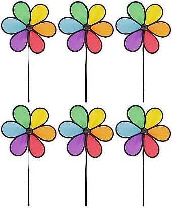 Small Rainbow Dazy Spinners are just the right size to give you a special touch of kinetic color. These can be easily hand held for festivals. The 12 inch diameter 6 petal wheel has been assembled. Made with quality weather resistant polyester fabric. Complete with 17 inch fiberglass pole. Easy assembly required. Place these spinners anywhere in your garden landscape, around the patio or in potted plants.